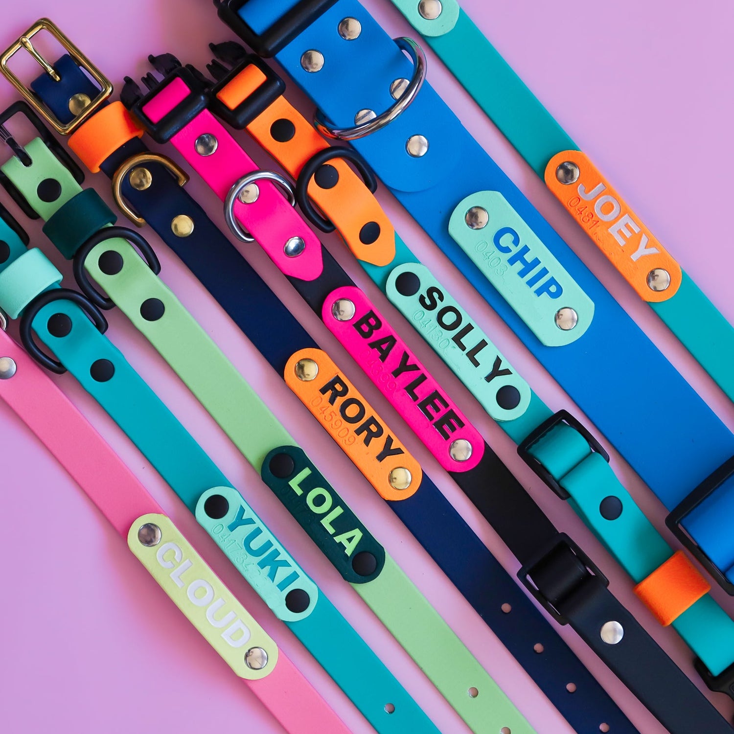 Heat-embossed and hand-painted name plates that look great and keep your dog’s details front and center. Don’t let them leave home without one!